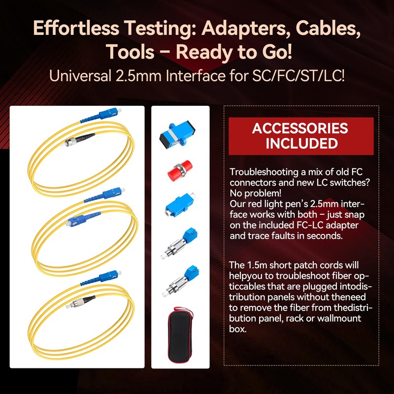 - 【Universal Compatibility】:The locator's 2.5mm universal connector works seamlessly with ST,SC,and FC interfaces,making it ideal for both single-mode and multi-mode cable testing. (For LC cables,simply use the FC Male to Female LC connector.)