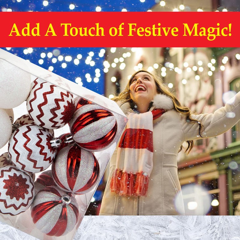 - SPARKLE & SHINE: Each bauble has been beautifully made with white glitter and red metallic exterior. This pack of 24 contains 3 assorted patterns; stripe, zig-zag and snowball.