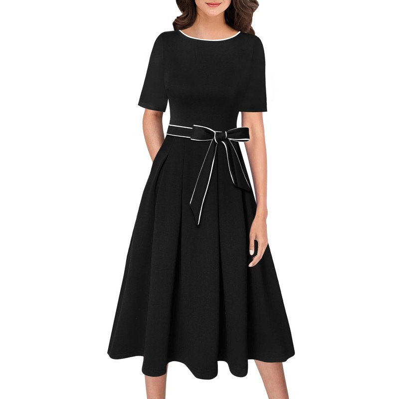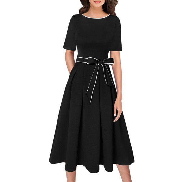 VFSHOW Womens Black Elegant Pockets Belted Pleated Wear to Work Business Office Casual Church Cocktail A Line Fit and Flare Midi Dress 10119 BLK XL
