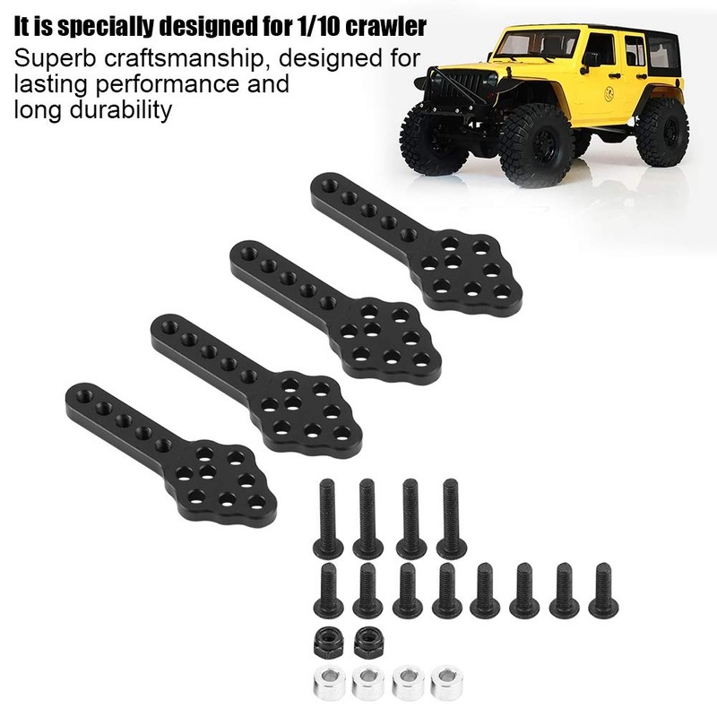 It is specially designed for 1/10 crawler This is a whose set of shock absorber mount, including 4 shock absorber plate mount, meeting your needs. It is adjustable because there are many mounting holes. It helps to adjust the angle and height of the shock absorber. Metal is durable and high-quality.