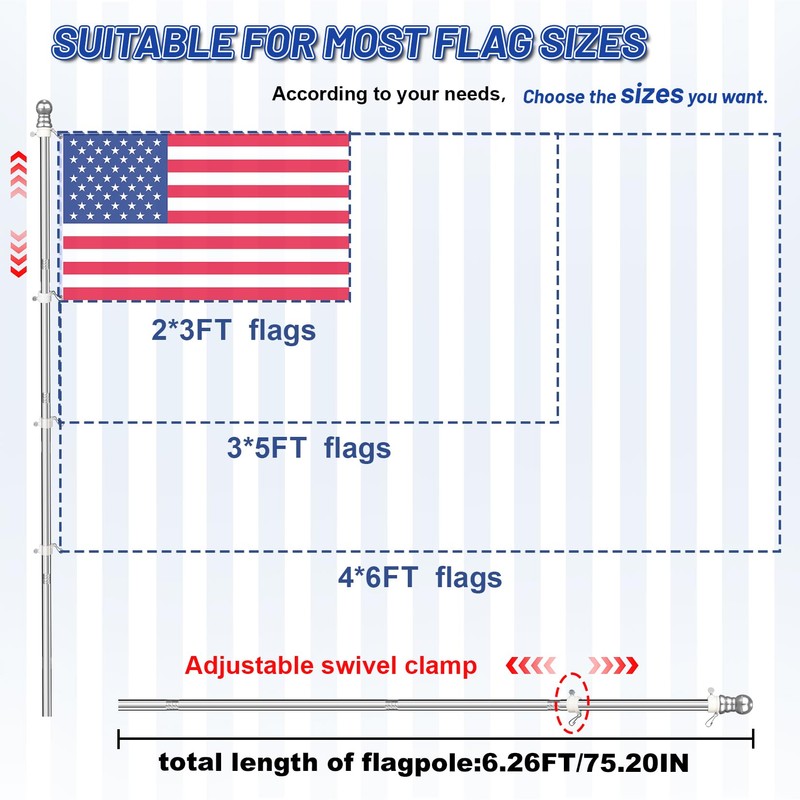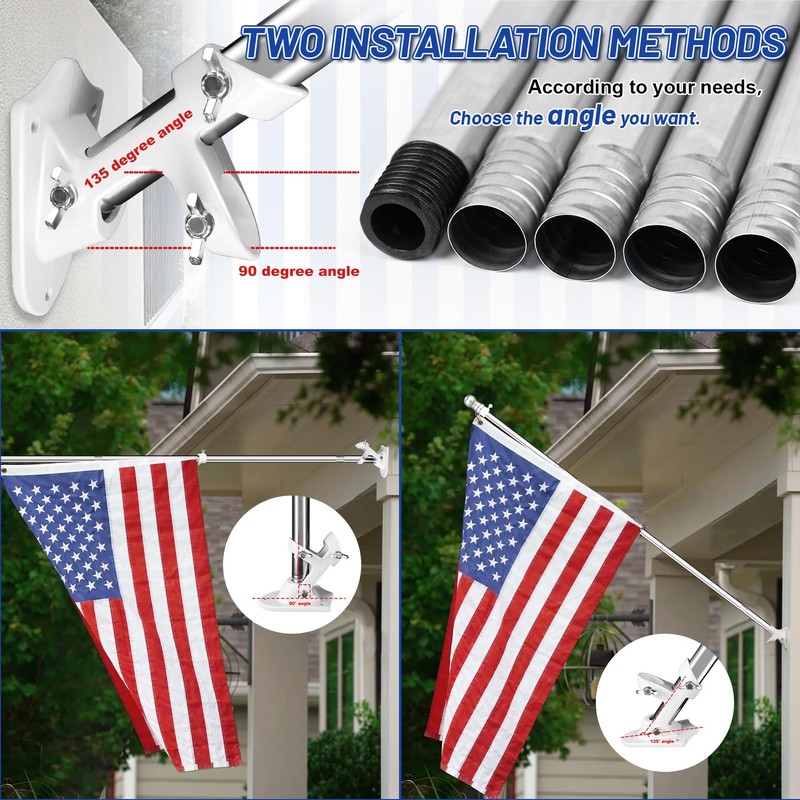 • American Flag Kit for Outside 3x5 with Pole Multi-Directional Display: American flags for outside with pole kit high-quality tangle-free flagpole is 6 feet long. designed for 2x3ft, 2.5x4ft or 3x5ft us flag with seal or sleeve. with adjustable flagpole bracket, it can be installed anywhere at any angle, and can be mounted on walls, patios, roofs or even trucks