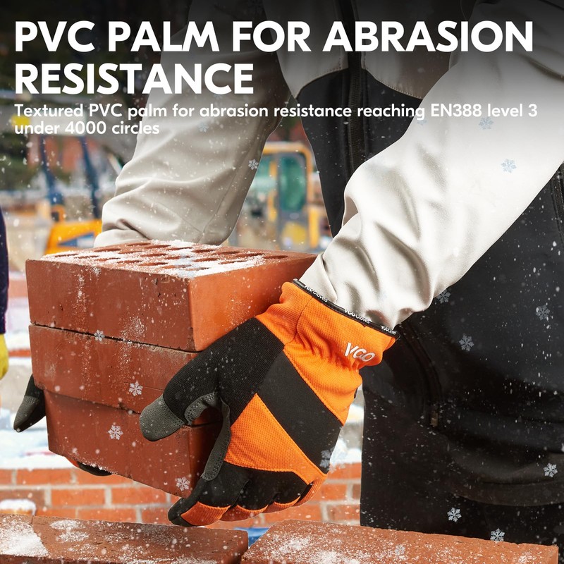 - ABRASION RESISTANCE & DEXTERITY - Durable PVC Palm for abrasion reaching EN388 level 3 under 4000 circles. Stretachable back with elastic cuff offers dexterity