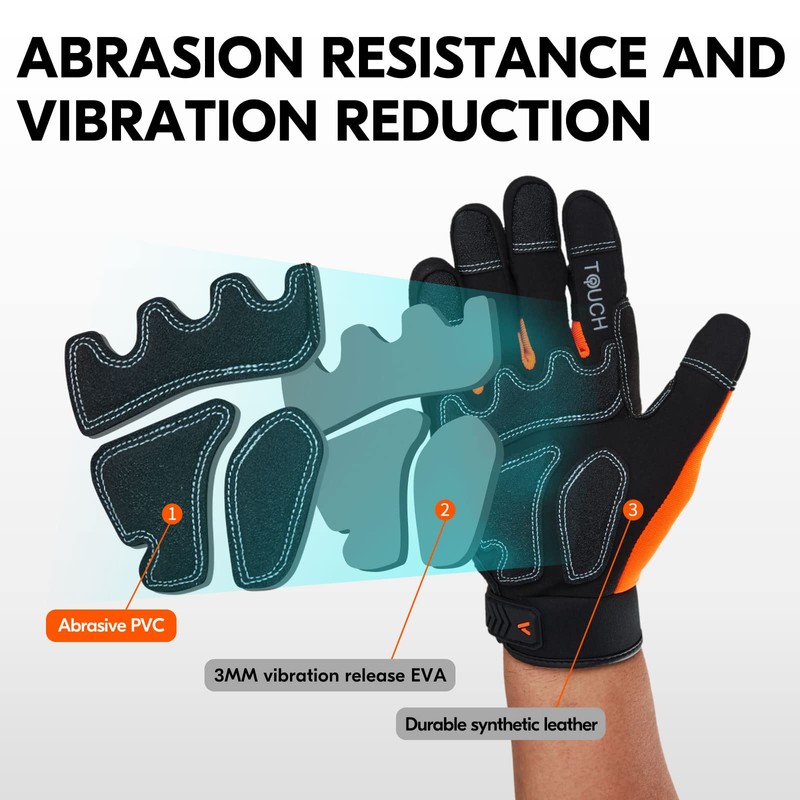 - Impact and vibration reduction – 3D textured PVC/TPR patches on the back for high impact protection. Highly flexible EVA padding with stereoscopic vibration resistance. Soft faux leather with PVC reinforcement for abrasion up to EN388 Level 3 under 2800 revolutions.