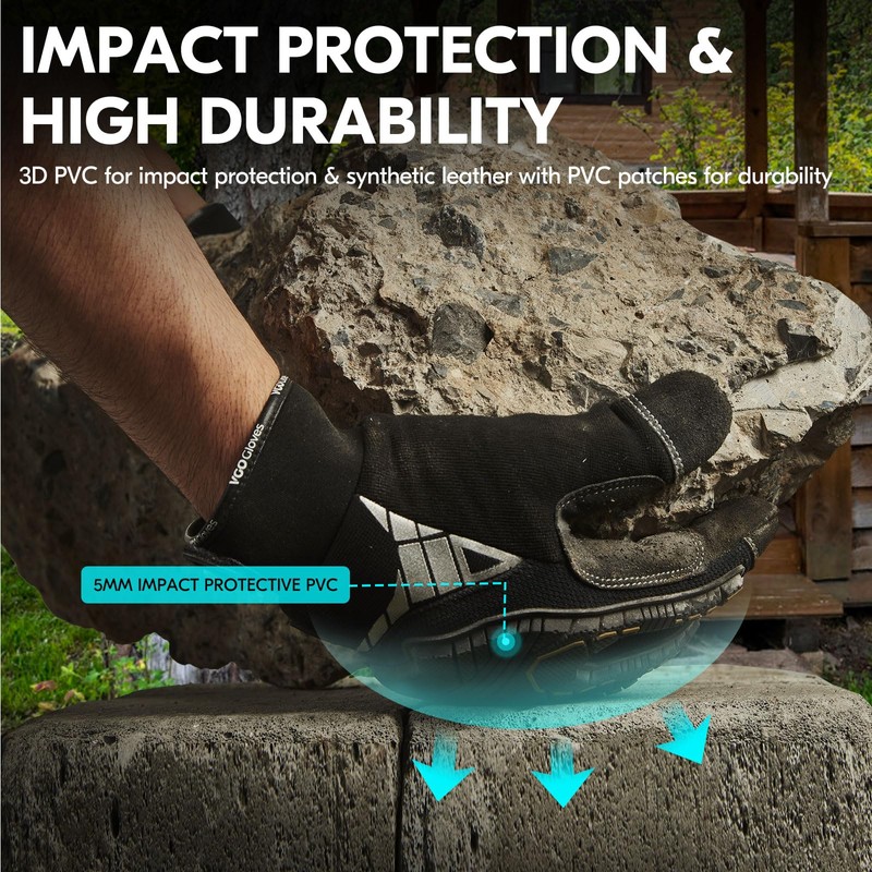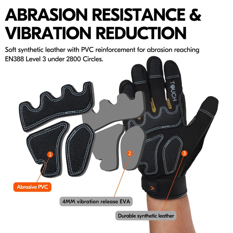 • Impact and vibration reduction – 3D textured PVC/TPR patches on the back for high impact protection. Highly flexible EVA padding with stereoscopic vibration resistance. Soft faux leather with PVC reinforcement for abrasion resistance up to EN388 Level 3 under 2800 revolutions