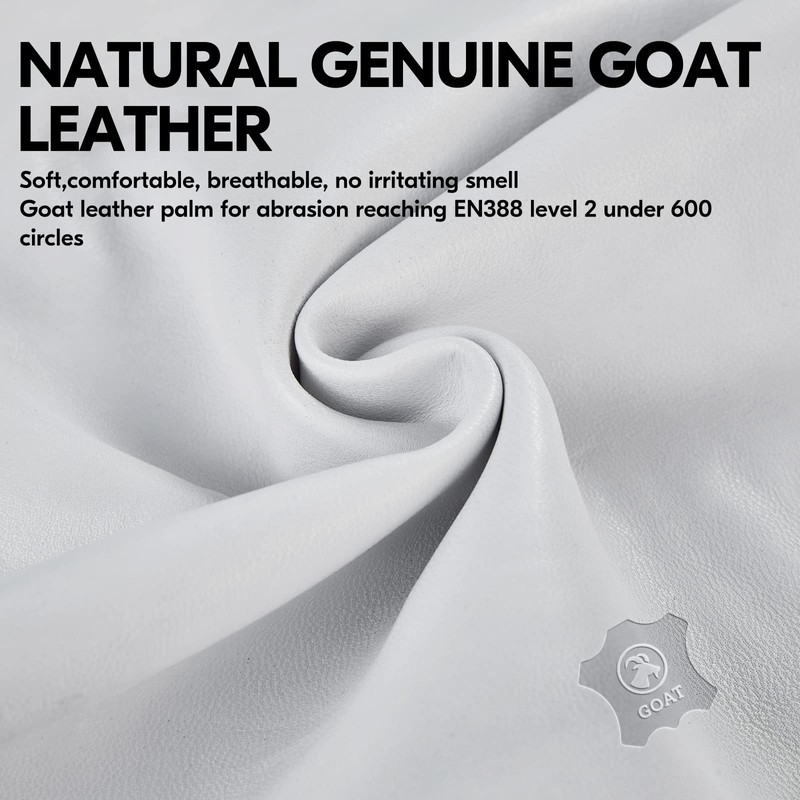 - PALM & BACK & CUFF - High visibility orange stretch spandex back also provides exceptionally dexterity and breathability. Premium Goatskin leather palm provides comfort and dexterity for all-day wear; Textured PVC palm patches offer extra durability. Neoprene cuff, hook and loop closure ensures a firm fitting