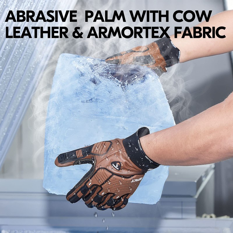 - IMPACT & VIBRATION REDUCTION, ABRASION RESISTANCE - 5mm 3D-structured PVC/TPR patches on the back extending to fingertips for great impact protection. Cow leather Palm for abrasion reaching EN388 level 3 under 2000 circles, with CE Standard 20000 circles abrasive Amortex fabric patch for high durability. High dexterity neoprene padding offering stereoscopic vibration resistance