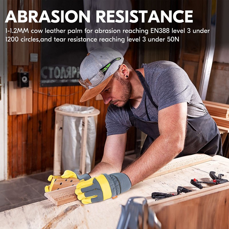 - MATERIAL - Carefully selected high-quality cow grain leather protecting hands from the hard environment in a wide variety of tasks. 1.0-1.2MM premium leather for abrasion reaching EN388 level 2 under 1200 circles,and tear resistance reaching level 3 under 50N. Soft and flexible with moderate oil resistance, puncture resistance, tear resistance and cut resistance. Palm leather is cloth-lined to reduce wear and for moisture absorption.