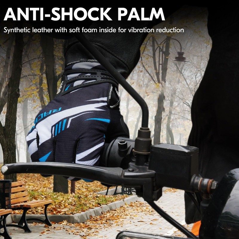 • VIBRATION REDUCTION, ABRASION RESISTANCE & GREAT GRIP - Soft elastic fabric palm with silicone print to increase friction and offer great grip, filled with 5MM foam effectively absorbing shock and reducing the impact of intense vibration