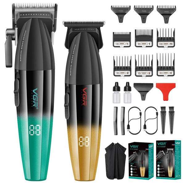 VGR Professional Hair Clipper and Trimmer Set for Men, Barber Clipper and Zero Gap T-Blade Trimmer Kit, Cordless USB Rechargeable Hair Cutting Kit with 9 Guide Combs, Ceramic Blade, LED Display