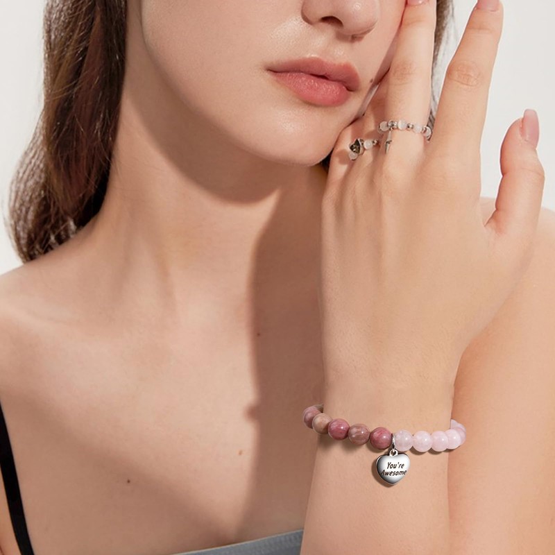 - Size and Material: Handcrafted from 8mm natural stone, 7 inches in length, fits most women. Heart charms and laser engraved text in stainless steel