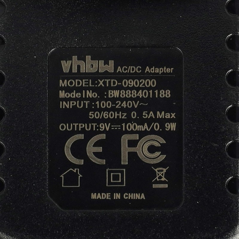 - Input AC: 100-240 V / 0.5 A Max | Output DC: 9 V, 0.1 A | Frequency: 50-60 Hz | Cable length: 200 cm | Colour: Black