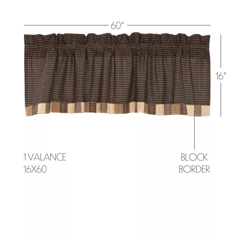 A neutral, primitive palette of khaki tan, creme and black blend the crisp lines of windowpane plaid with charming patchwork blocks for a unique country look. The Kettle Grove Block Border Valance measures 20x60 inches and features a straight edge accented by blocks in vintage-inspired patterns for a classic country look. A generous 3.25 inch rod pocket allows for easy hanging.