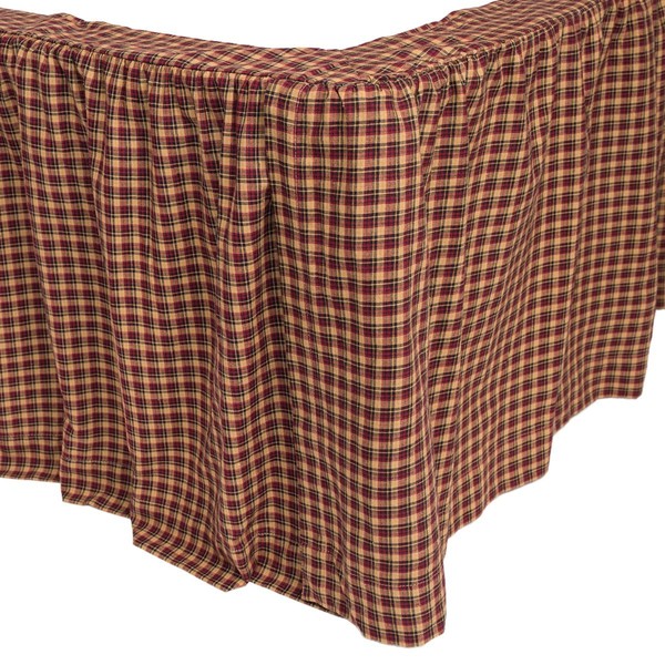 * Gathered ruffle is red, navy and tan plaid fabric with 16" drop * Hem fold * White cotton deck trimmed on three sides with 3" fabric strip matching the ruffle to conceal the white fabric from view * Finished with split corners * Single fabric: Machine stitched