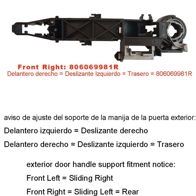 • The item does not fit the sliding door. Fits the driver's side: OE part number: (suitable for front right) 806069981R, 806067794R, 806069981R; (suitable for front left): 806079208R, 806076452R, 82007666. 6866, 8, 06075481R, 806078197R, 806071150R, 806070377R