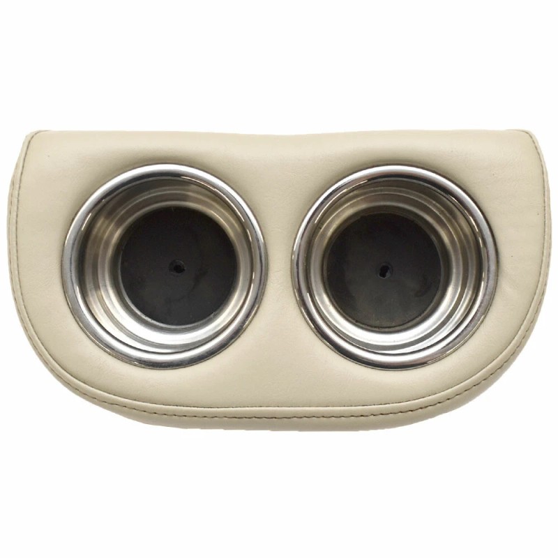 This armrest is constructed out of taupe colored vinyl over foam padding and features (2) 3 1/2" Dia. stainless steel cupholders and measures approximately 11 1/2" L x 6 1/4" W x 7 3/4" H overall.