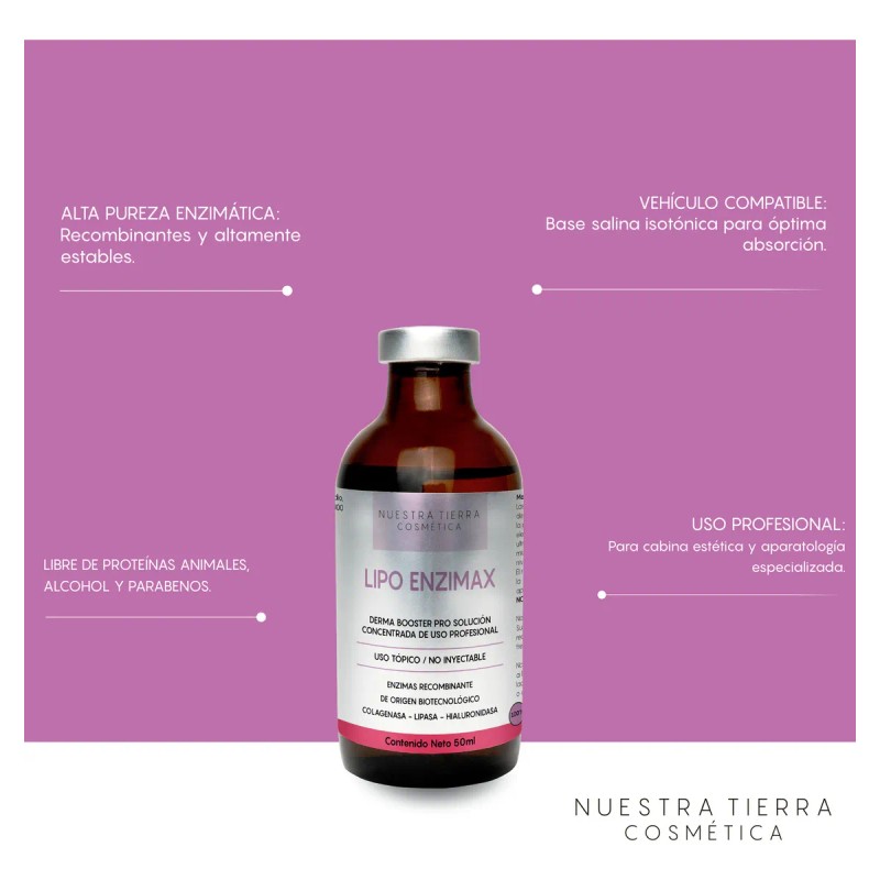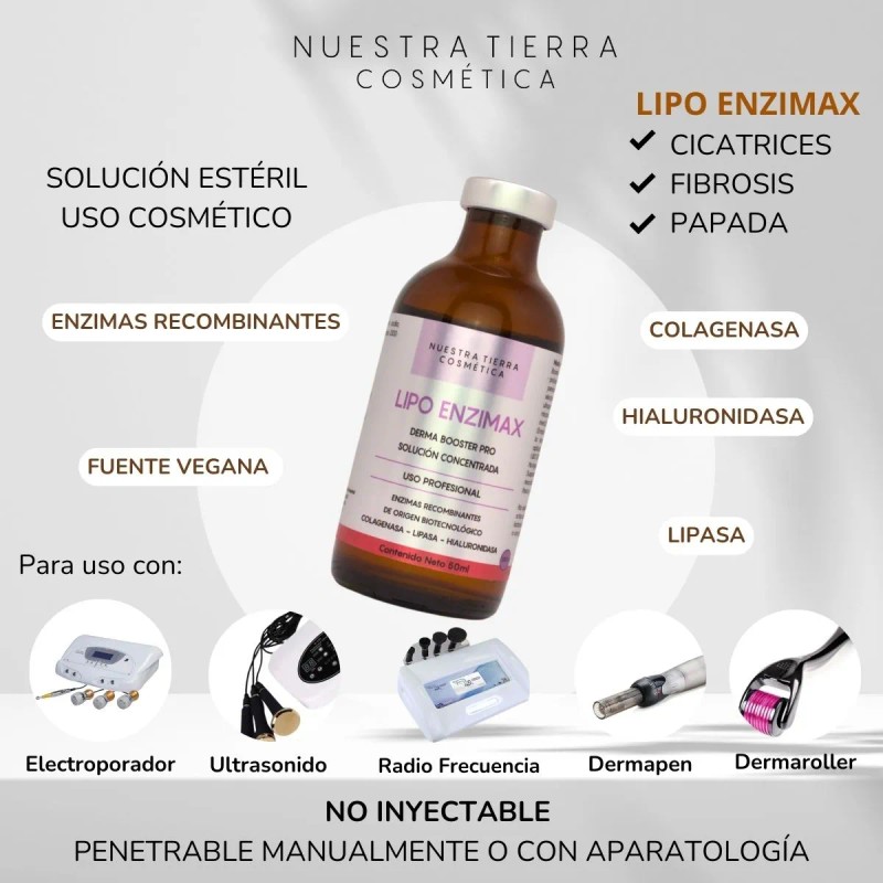Solución concentrada con colagenasa, hialuronidasa y lipasa que son enzimas recombinantes (un grupo de proteínas que se obtienen de fuentes veganas gracias a técnicas de biología molecular).