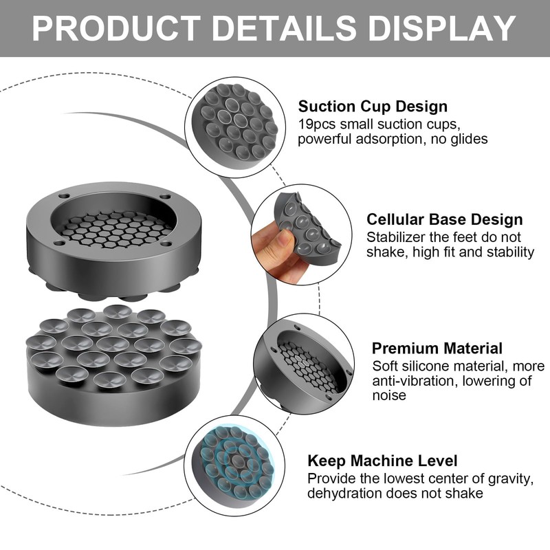 - Vibration noise reduction: the vibration damper washing machine reduces the noise and vibrations that occur when operating your washing machine. The anti-vibration mat washing machine damper is equipped with 19 suction cups that provide excellent grip on smooth floors.