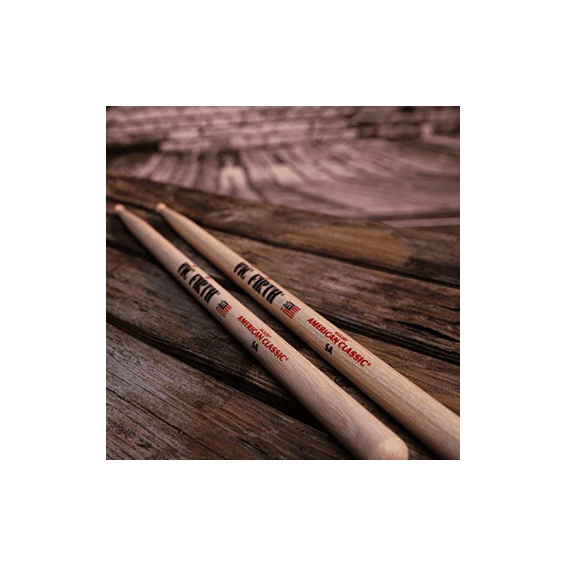- The included Vic Firth 5A American Classic drumsticks are turned from select hickory, a dense and durable wood with little flex for a more pronounced sound, capable of withstanding a great deal of shock; the tips are deeply back-cut for intensified cymbal response
