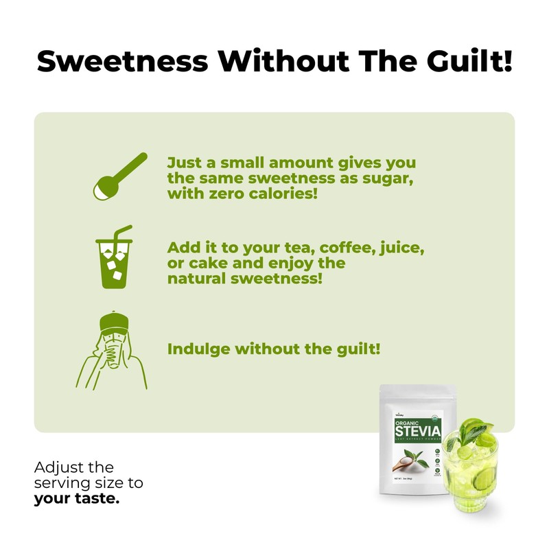 --Versatile in its usage, our pure stevia can be easily incorporated into your daily routine. Add it to your morning coffee, tea, or smoothie for a natural boost of sweetness. Use it in your baking recipes to create delicious, low-calorie treats. Or simply sprinkle it on your fruits and cereals for an added touch of sweetness.