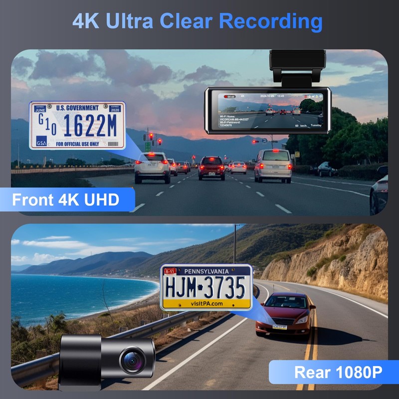 - 【4K+1080P Dual Recording】Our Vehicle UHD dashboard camera record your journeys in stunning 4K resolution with the front camera, while the rear camera captures 1080P footage at 60fps. This dual cameras setup ensures that every critical detail, front and back, is captured in high quality, such as license plates and road signs, ensuring image clarity even at high speeds.