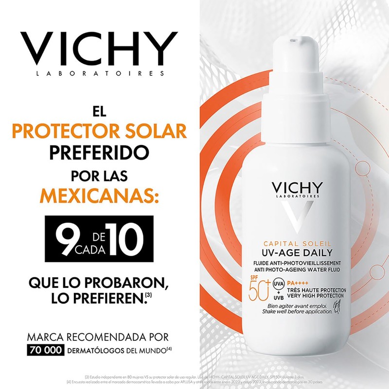 - UV-AGE DAILY es el primer protector solar fluido anti-fotoenvejecimiento de Vichy, con una acción doble protectora y correctora.