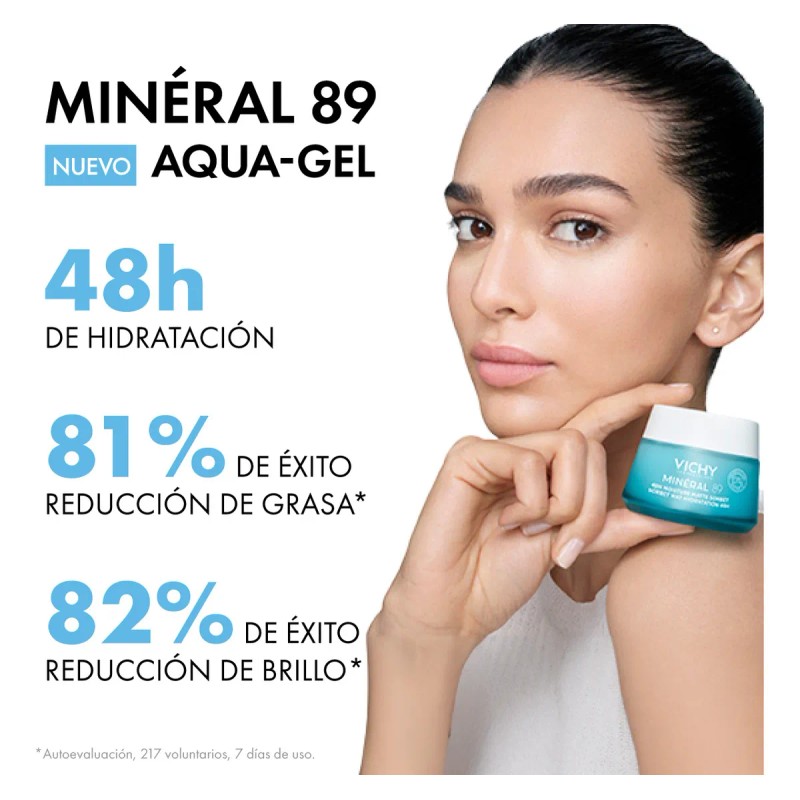 Descubre el poder del 'Minéral 89 Aqua-gel Matificante 50ml' de Vichy, un gel hidratante que proporciona una hidratación intensa durante 24 horas, ideal para el cuidado diario de tu piel. Su fórmula innovadora está diseñada para reducir hasta un 98% la sobreproducción de sebo, lo que lo convierte en el aliado perfecto para pieles mixtas.