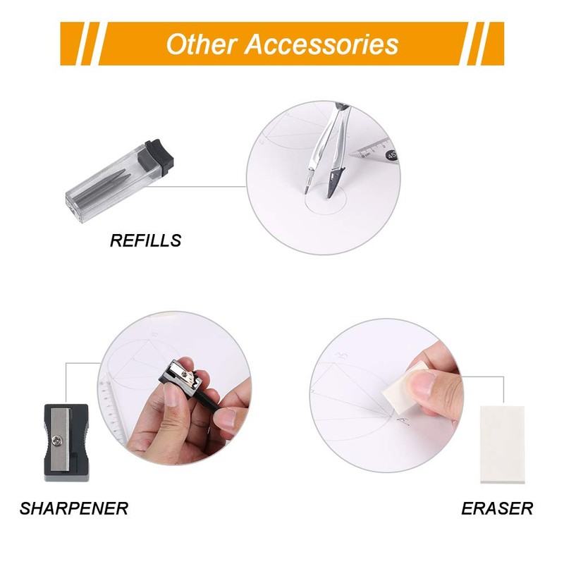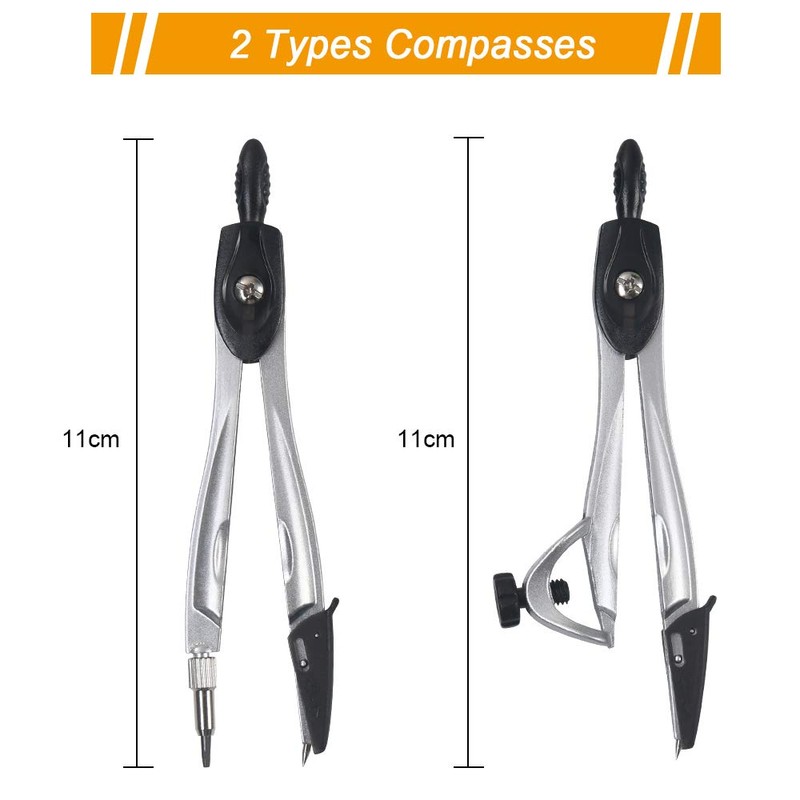 - 2 pieces compasses: 2 different drawing types compass, which are suitable for precise building and drawing. The radius can be quickly adjusted. It can meet different drawing requirements.