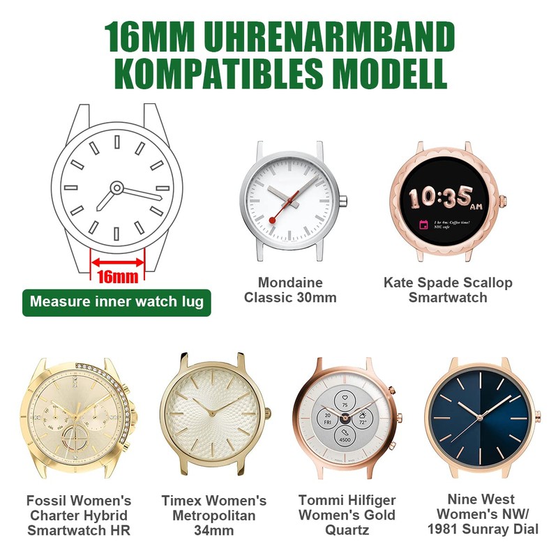 - How to choose the right size: Please measure the lug width (the inner width of the watch where it attaches to the strap) carefully before purchasing. Choose the appropriate size according to this width. We offer a choice of 16 mm, 18 mm and 20 mm. Suitable for most watch brands