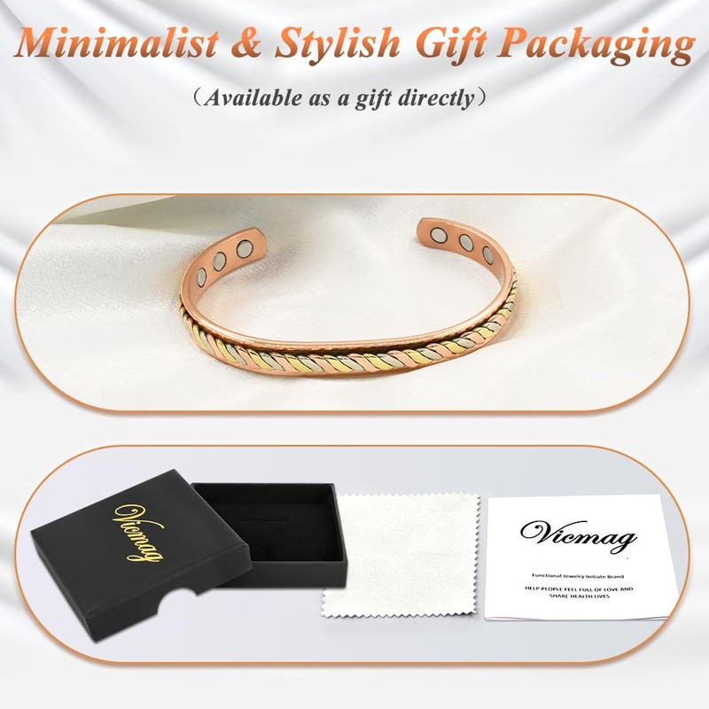- ✨ Fashion Copper Bangle ✨ Inspired by the beauty of the three color, one of the most popular fashion symbol, it is very generous, practical and beautiful. Also inspired by the primitive simplicity, there is no lack of modern fashion sense. It is so fashionable that no one will doubt that it is a copper magnetic bracelet.