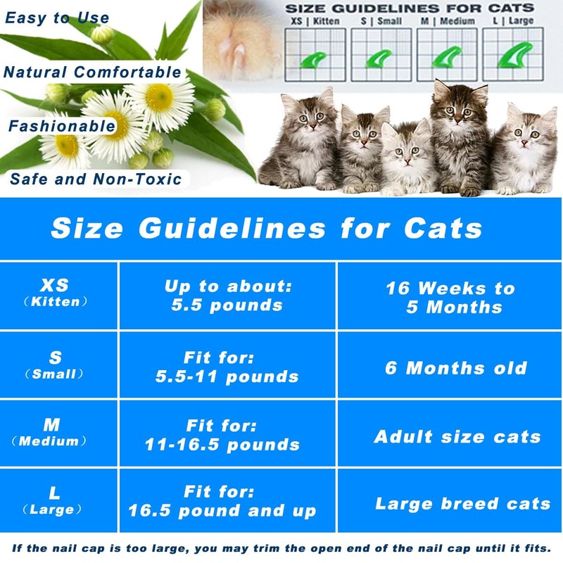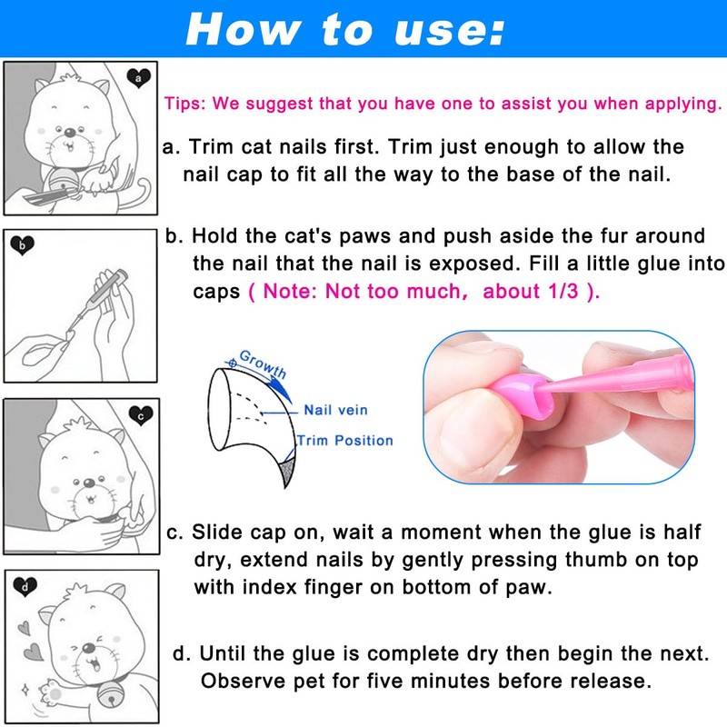 - 【After Applying】Some cats will try to bite away the nail caps after they are initially put on. Once it happens, immediately cry it down until they are used to the caps. Nail caps should always be replaced after 8 weeks.