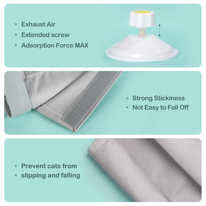 • Upgrade Strong Suction Cups: The carefully produced cat hammock is firmly mounted on the window through 4 strong suction cups. The suction cup with a diameter of 3.35 inch ensures the stability of the cat hammock when it is installed on a smooth surface. There is no need to worry about falling, providing a safe and comfortable resting environment for your cat