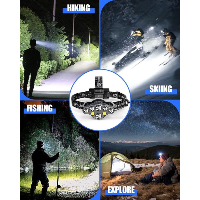 - Illuminate Your World: The ultimate outdoor companion, our head lamp features eight powerful LED lights that provide up to 18000 lumens max, ensuring that you can see everything around you clearly, whether you're exploring caves, running in the dark, camping under the stars, or enjoying other outdoor activities.