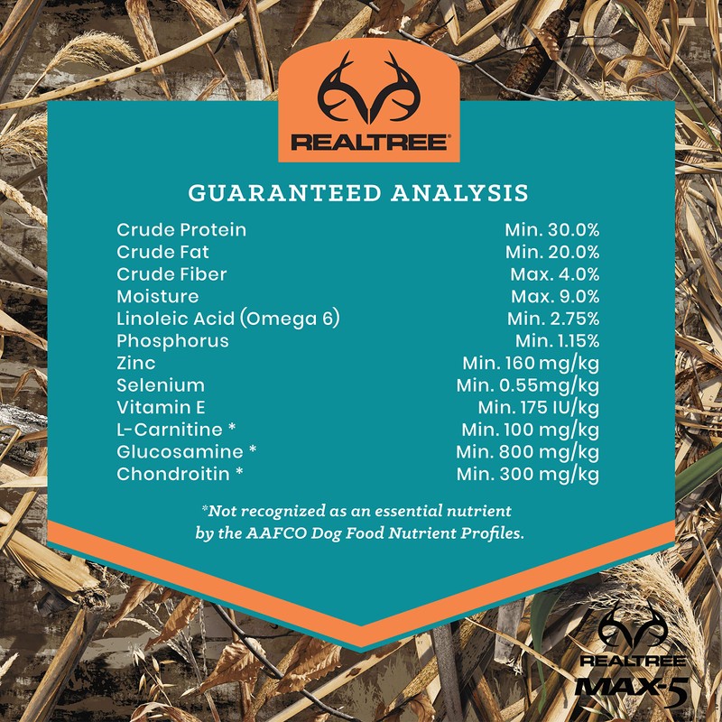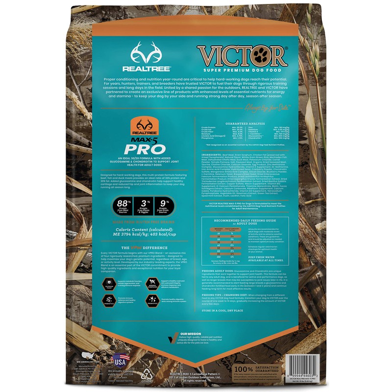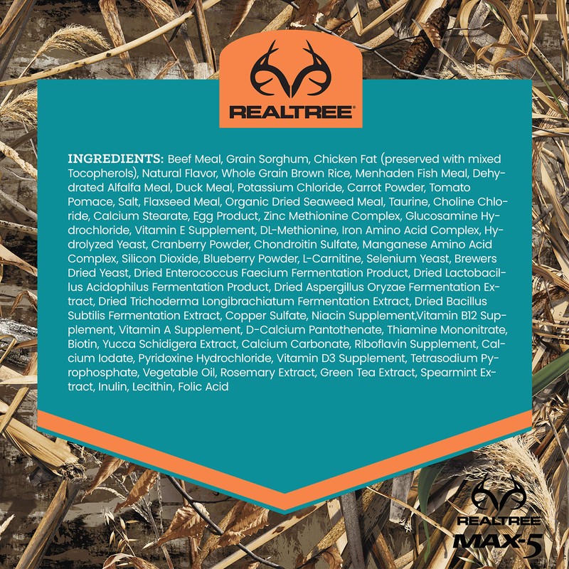 Designed with hard-working dogs in mind, VICTOR’s REALTREE MAX5 PRO provides an ideal ratio of 30% protein and 20% fat. This multi-protein formula features beef, fish, and duck meals along with added glucosamine and chondroitin to support healthy cartilage and reduced hip and joint inflammation, keeping your dog running all season long.
