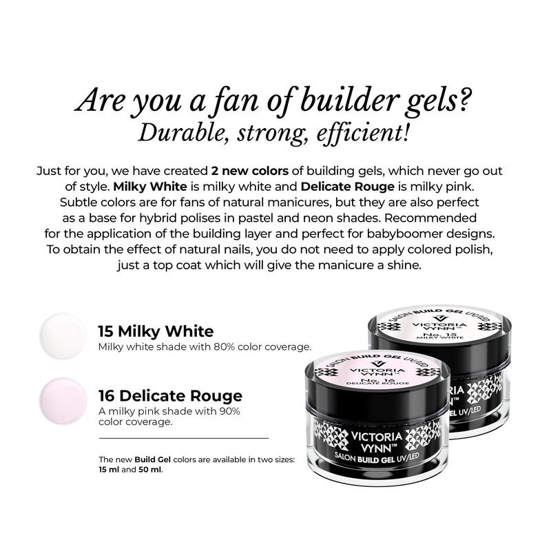- 2 CAPTIVATING NEW COLOURS! – Your favourite nail gel, now available in two brand new subtle shades: Milky White and Delicate Rouge, adding a touch of elegance to your nail creations. Absolutely perfect for babyboomer designs.