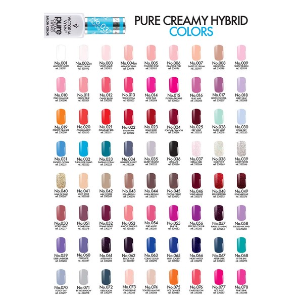 - Creamy hybrid creams Pure Creamy Hybrid - created in a modern, safe formula with high durability up to 4 weeks. Pure hybrid varnish colours are created based on the trends. 100% satisfaction already with the first applied and hardened layer.