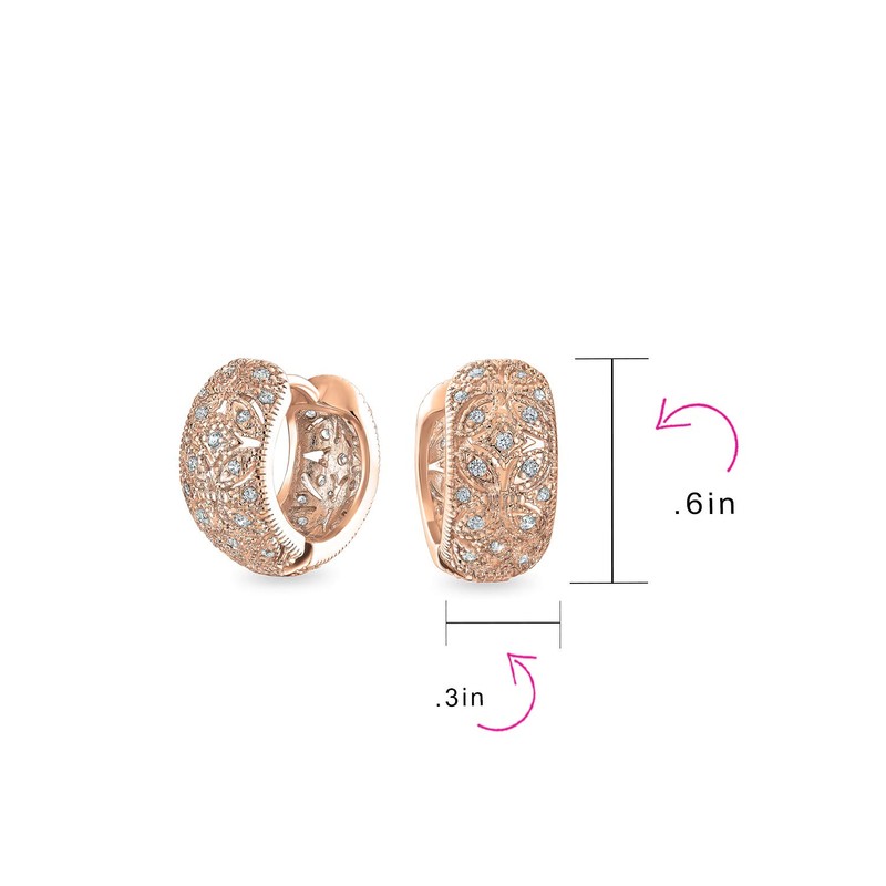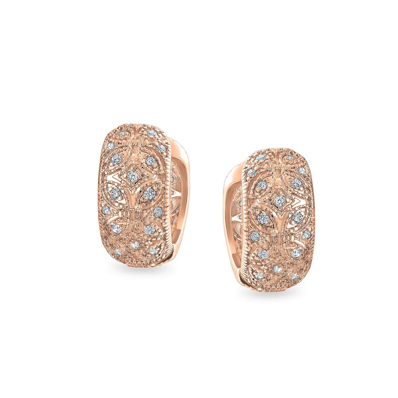 Victorian Style Open Filigree Flower Wide Huggie Hoop Earrings CZ Accent Cubic Zirconia Rose Gold Plated Brass
