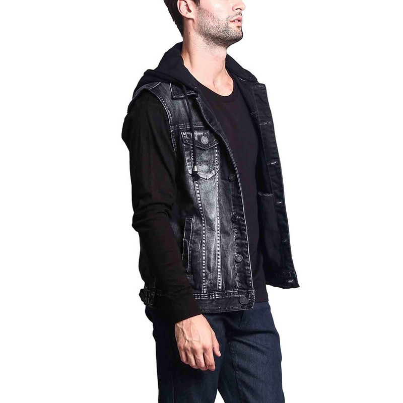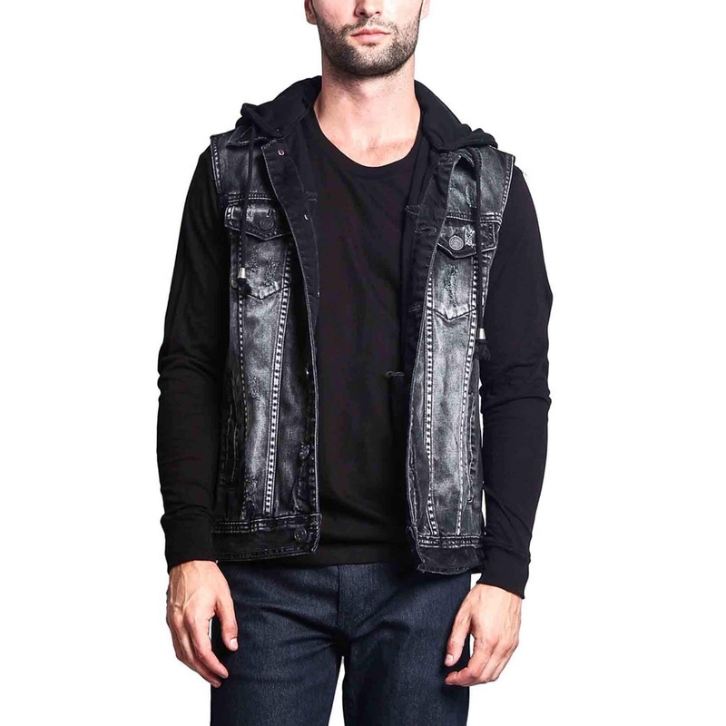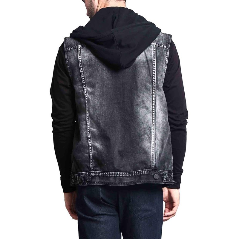 VICTORIOUS Detachable Hood Denim Jean Vest Jacket DK108 - Distressed Black - Small - GG1F