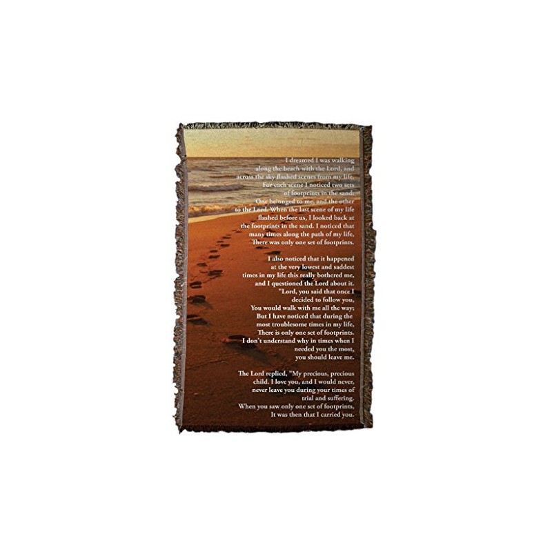 - BLANKET - Footsteps in the Sand Woven Blanket. This wonderful blanket measure 35” x 54” and features our Footsteps in the sand design. Our designs are printed in full color using washer safe inks. This religious throw blanket features a full color design on one side, and brown on reverse. This throw blanket features woven fringe on the side and is made with beautiful, soft materials.