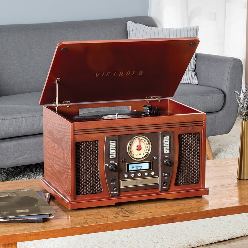 The Victrola Aviator Signature 8-in-1 Bluetooth Record Player combines a classic look with high-tech features. Its 3-speed, belt driven turntable plays all your favorite vinyl records, and that's just one of many awesome features, such as CD, cassette, and USB player, as well as FM radio and Bluetooth compatibility that allow you to wirelessly stream your favorite music.