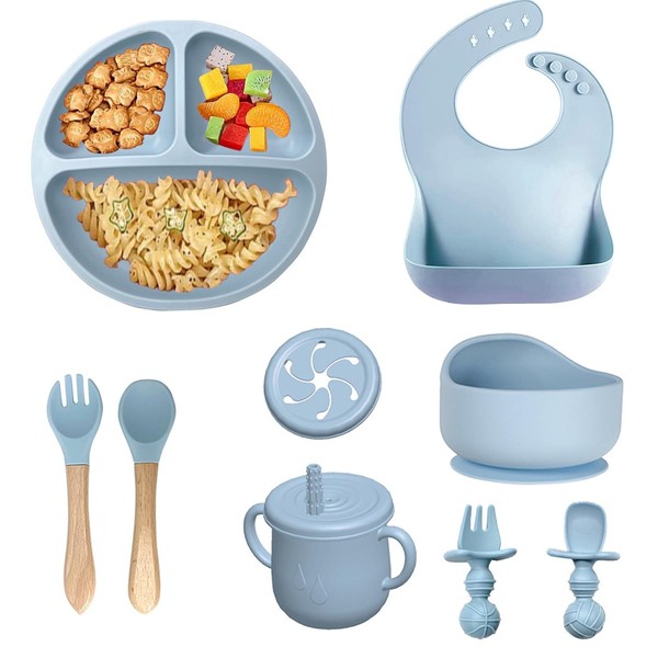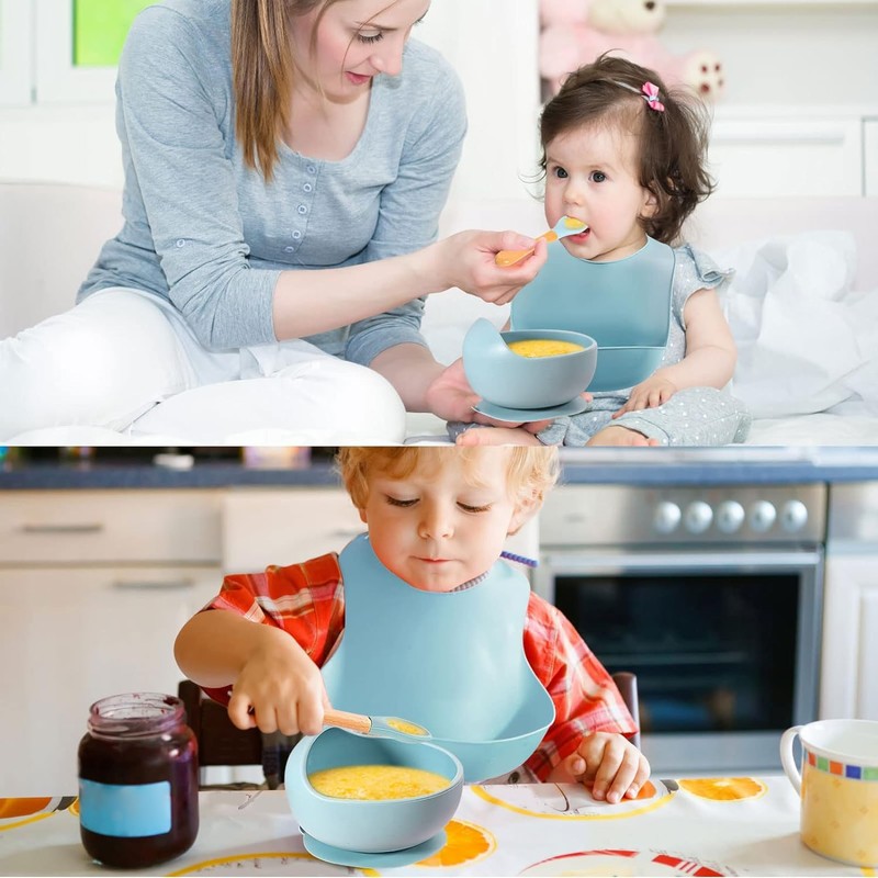 VIDA4U 9pcs Plato Silicona para Bebe, Set Alimentación Complementaria, Juego de Vajilla con Babero y Cuchara para Niños, Antideslizante, Fácil de Limpiar y Libre de BPA