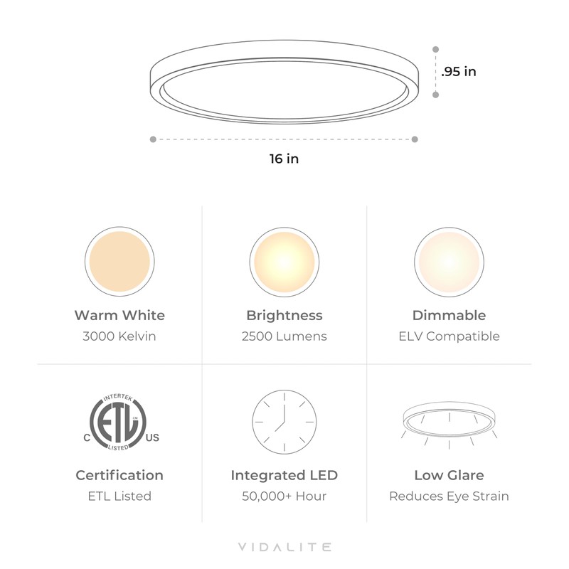 VidaLite Black 16in Round Integrated LED Surface Light, Slim Flush Mount Ceiling Light, Comfortable Low Glare, Edge-Lit Tech, 3000K, 2500 Lumens, ELV Dim