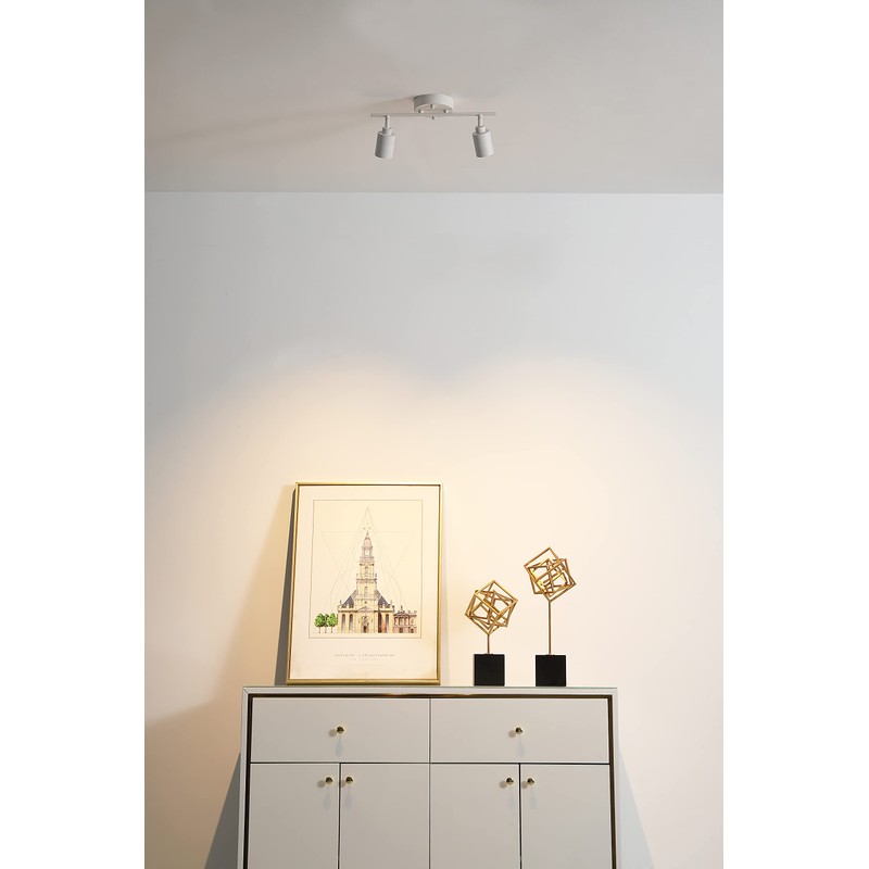 - Color & Features: This fixture has 2 spotlights attached to an aluminum track, finished in Matte White. Each spotlight can be individually adjusted 270° horizontally and 90° vertically.