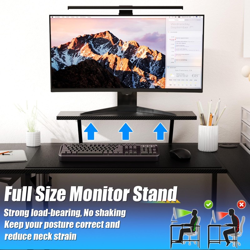 - 【Charging Station On Monitor Stand】This black computer desk has 4 built-in power outlets, 2 USB ports for charging computers, laptops, office equipment or gaming devices. The monitor stand helps to elevate your vision. monitor stand helps to elevate your vision and avoid neck and back pain