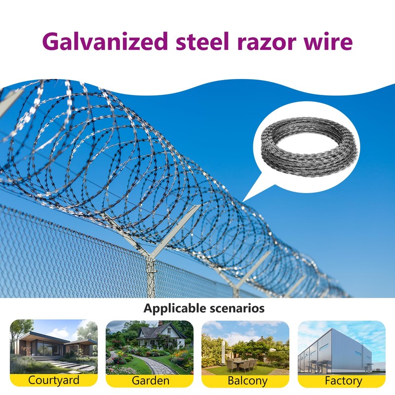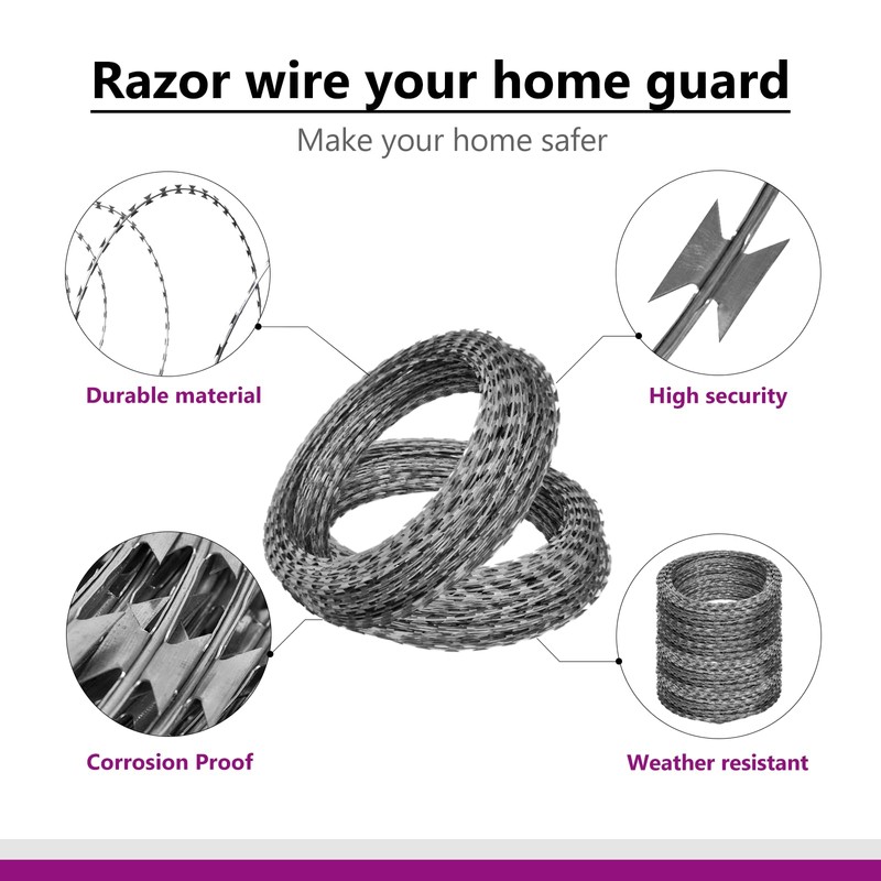 This sturdy Nato razor wire, which can be spread up to 328'/492'/197', is designed to help prevent unknown invaders effectively. When in use, the coiled wire length can be 82'-98'/43'-85'/56'-66'. The razor wire can be winded around the garden fence to add extra security and safety. And the design of blades keeps unwanted guests out of your garden and avoids mischievous intrusion.