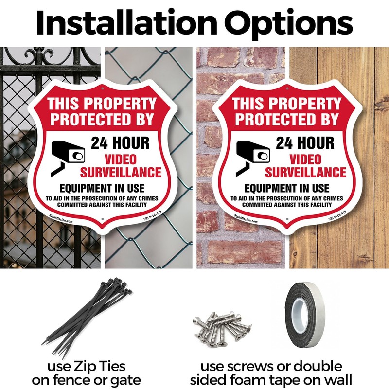 Video Surveillance This Property Protected By 24 Hour Video Surveillance Equipment In Use To Aid In The Prosecutution 12 inch X 12 inch Shield Shaped Commercial Grade Plastic Sign