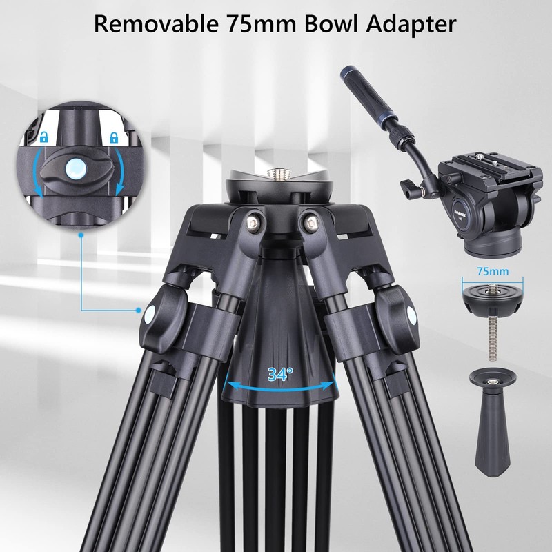 - 【75MM BOWL ADAPTER&QUICK LEVELING FUNCTION】: The Aluminum legs are sturdy and simple to adjust, and the video head quick release plate is quite large, so it works well with larger cameras and equipment. 75mm bowl adapt can adjust camera to be level quickly even on uneven ground