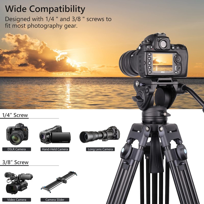 - 【SUPER STABILITY ALUMINUM TWIN TUBE VIDEO TRIPOD】: All metal construction, Upgraded aluminum alloy, solid and durable with efficient shock absorption, sound heat, and corrosion resistance. Max Load: 26.5lb/12kg, Working Height: 33.1''/84cm to 72.8''/185 cm and folded to 35.4 inches/90 centimeters for easy carrying,it can be in the professional tripod bag that is provided, enjoy your photography journey