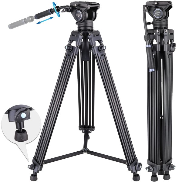 Video Tripod with 360 Panoramic Fluid Drag Pan Head Heavy Duty Aluminum Camera Twin Tube Tripod for DSLR Camcorder Monopod Canon Nikon Sony Load up to 26.5lb/12kg