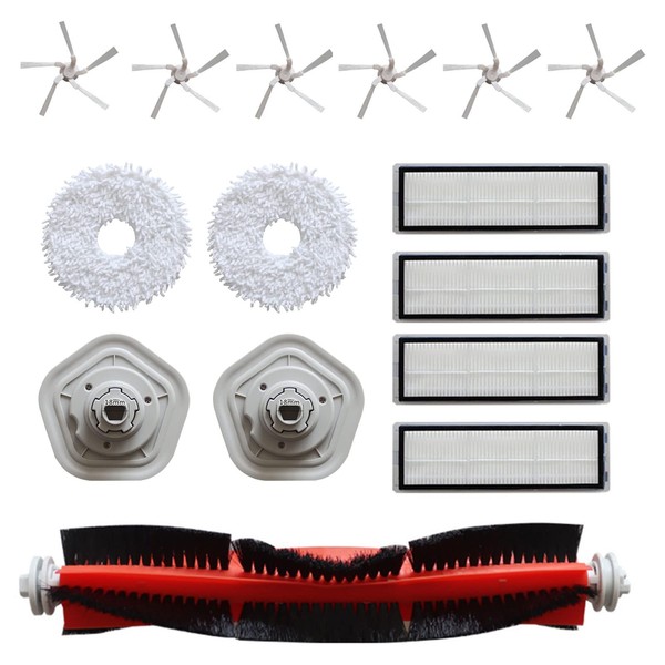 - [Function]: Package include 1pc Main Brush,6pcs Side Brushes,4pcs HEPA Filters,2pcs Mop Pads,2pcs Mop base.These accessories application to work on area rugs and sealed hard floors including hardwood, tile, marble, laminate and linoleum floor