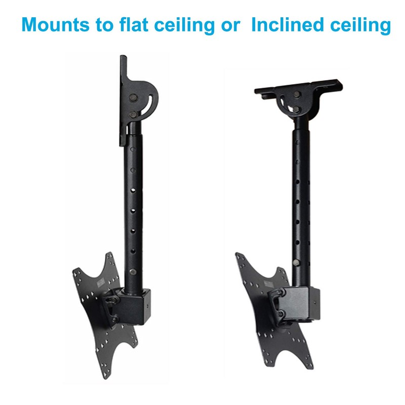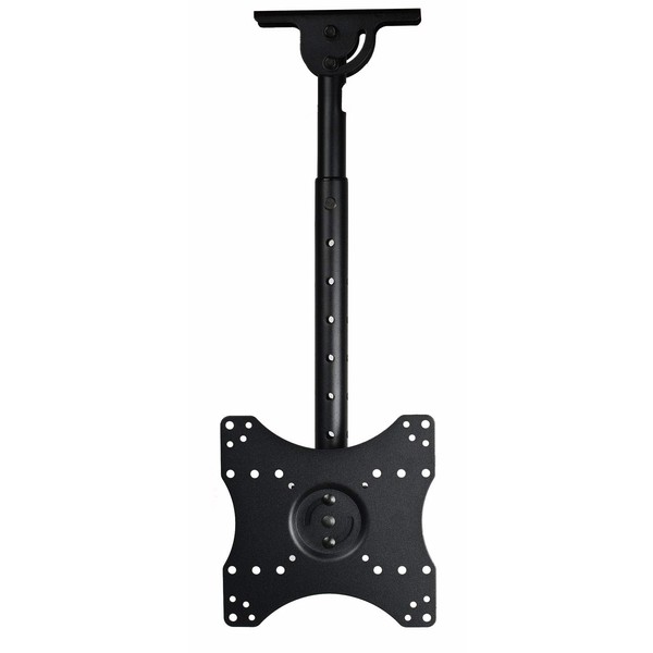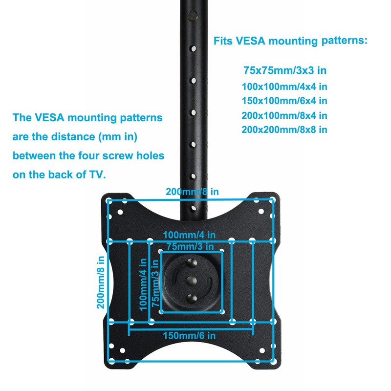 VideoSecu brand TV mount. Our LCD ceiling mounts offer exceptional range of movement while maximizing your workstation environment. This mount allows your flat screen or flat panel monitor to successfully adapt to any environment where a wall or desk mount is not an option. Once your LCD monitor mount is installed, you can change the height adjustment of your flat panel monitor to meet your specific needs. The pole height adjustment can be made in 1.5 inch increments (from 17.5 to 28.5 inches). TV plate center to ceiling adjustable from 10"-28" by 1.5 inches. This mount can be adjusted tilted forward 20 degree and tilted backward 5 degree, it can spin 360 degrees. Check the weight of your TV. It must be less than 66 lbs. If your LCD Monitor or TV has 4 holes on the back of the screen that are 75x75 mm/100x100mm/150x100mm/200x100mm/200x200mm apart from each other vertically and horizontally. In addition, Please check the area inside the 4 mounting holes to make sure there are not any plugs. Otherwise, the plate may block the plugs. If you currently have a stand attached to your LCD TV this is usually removed prior to fitting the wall mount and 4 holes should be revealed. Notice: This mount fits most 32-40" TVs (VESA 75x75mm(3x3")/100x100mm(4x4")/150x100(6x4")/200x100mm (8x4")/200x200mm(8x8")).